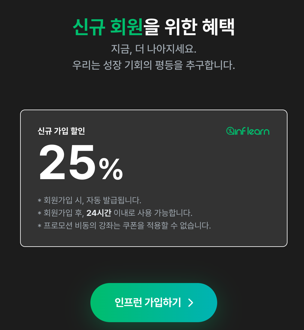 직무 관련 강의를 들을때 인프런을 많이들 이용하실텐데요.회사에서 강의를 결제해주긴 하지만, 개인적으로 필요한 강의가 있어서 이번에 결제하면서 할인 쿠폰을 받는 방법에 대해서 찾아봤습니다. 가입 환영 쿠폰 (25%)인프런 신규 가입을 하시면 신규 가입 할인 쿠폰을 받을 수 있습니다.25% 쿠폰을 줍니다.아직 인프런에 가입하시지 않으셨다면 가입 후 해당 쿠폰을 사용하시면 됩니다. 이제부터는 기존 가입자들도 사용할 수 있는 쿠폰에 대해서 알아보겠습니다. 카카오톡 친구 추가 쿠폰 (10%)인프런 카카오톡 플러스 친구를 추가하면 10% 할인 쿠폰을 줍니다.아래 링크는 누르시면 인프런 카카오톡 플러스 친구를 등록할 수 있습니다. 인프런라이프타임 커리어 플랫폼, 인프런에서 함께 배우고, 나누고, 성장하세요.pf.k..