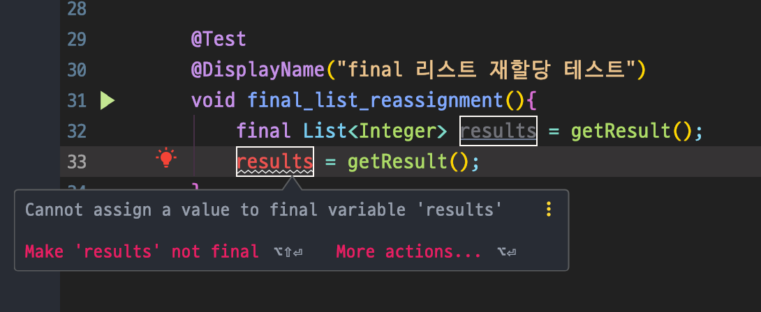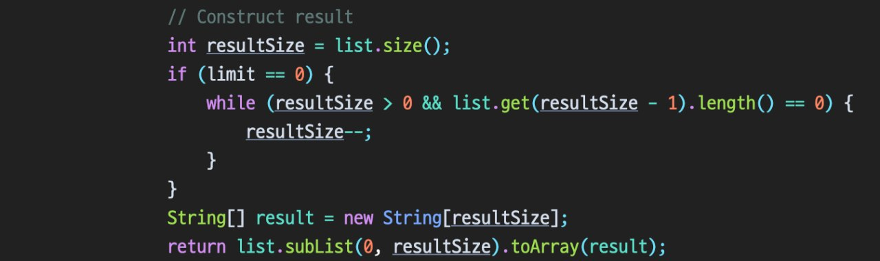 String split method에서 limit 값을 이용해 결과 배열의 길이를 제어하는 방법에 대해 알아보자. Syntax public String[] split(String regex, int limit) Params regex − the delimiting regular expression. limit − the result threshold, which means how many strings to be returned. Return value the array of strings computed by splitting this string around matches of the given regular expression 예시 limit이 0인 경우, 0보다 큰 경우, 0보다 작은 경우에 따라..