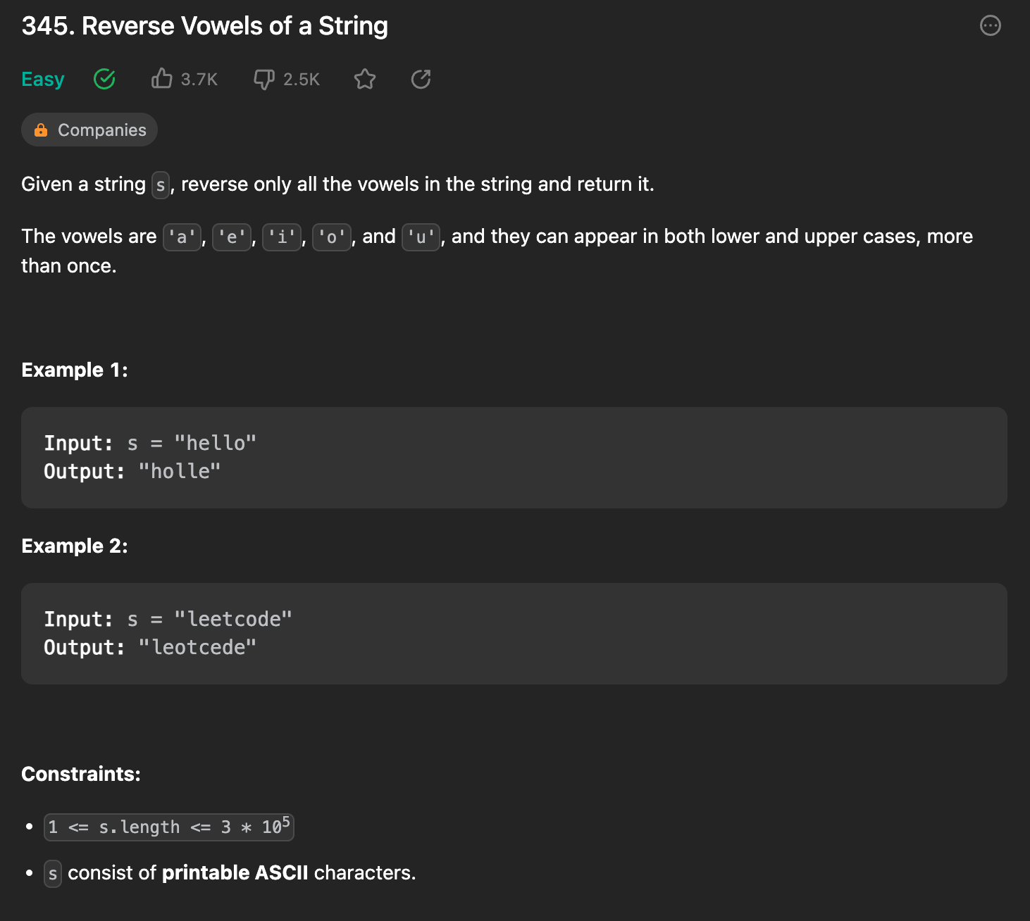 문제 주어진 문자열에서 모음(vowels)들만 뒤집어 반환하는 문제입니다. 모음은 'a', 'e', 'i', 'o', 'u' 다섯 가지로 구성되어 있으며, 대소문자를 구분하지 않습니다. 풀이 문자열을 처리하기 위해 투포인터를 활용하여 문제를 해결할 수 있습니다. 주어진 문자열을 리스트로 변환합니다. 이렇게 하면 문자열의 각 문자에 직접 접근하여 값을 변경할 수 있습니다. 파이썬에서 문자열은 불변한 자료형이므로 리스트로 변환하여 가변한 형태로 다루는 것이 유용합니다. 왼쪽 인덱스(left_index)를 문자열의 시작 위치(0)로, 오른쪽 인덱스(right_index)를 문자열의 끝 위치(len(s) - 1)로 초기화합니다. 왼쪽 인덱스와 오른쪽 인덱스가 만나기 전까지 다음 작업을 반복합니다: 만약 왼쪽 인..