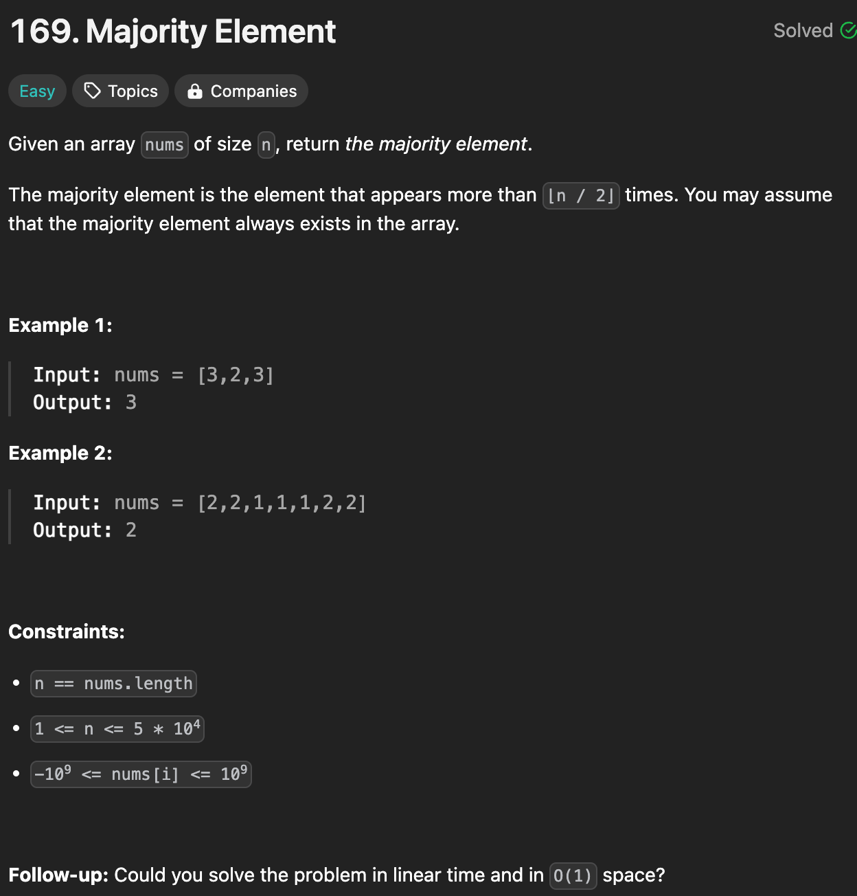 문제 배열에서 특정 요소가 과반수 이상 등장하는 경우 그 요소를 찾는 문제입니다. 과반수 요소는 배열의 길이 n의 절반 이상 등장하는 요소로 정의됩니다. 주어진 배열 nums에서 과반수 요소를 찾는 문제입니다. 과반수 요소는 항상 존재한다고 가정합니다. 풀이해당 문제는 Hash Map를 이용해서 풀 수 있습니다. 하지만 이 문제의 추가 조건으로 로 “문제를 O(n) 시간 복잡도와 O(1) 공간 복잡도로 해결할 수 있는지”가 주어졌습니다. Hash Map를 이용하면 공간복잡도가 O(n)으로 해당 조건을 만족할 수 없습니다. 해당 조건에 맞춰 문제를 해결하려면 Boyer–Moore majority vote algorithm를 이용하여 풀 수 있습니다.Boyer–Moore majority vote algo..